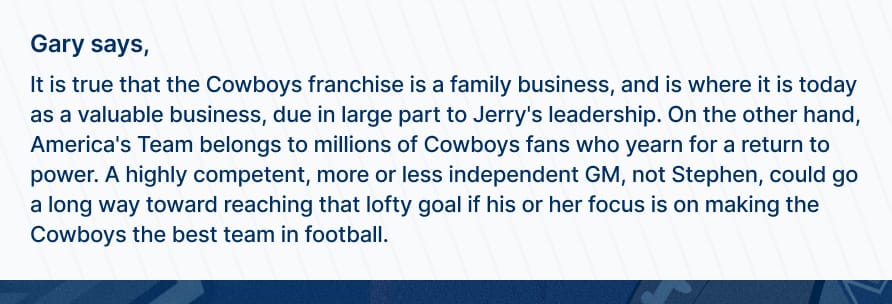 Based on Jerry Jones’ comments, we asked whether you’d like to see someone else take over as general manager in yesterday’s edition. An overwhelming 91% of you voted yes. Here’s what one of our readers had to say: